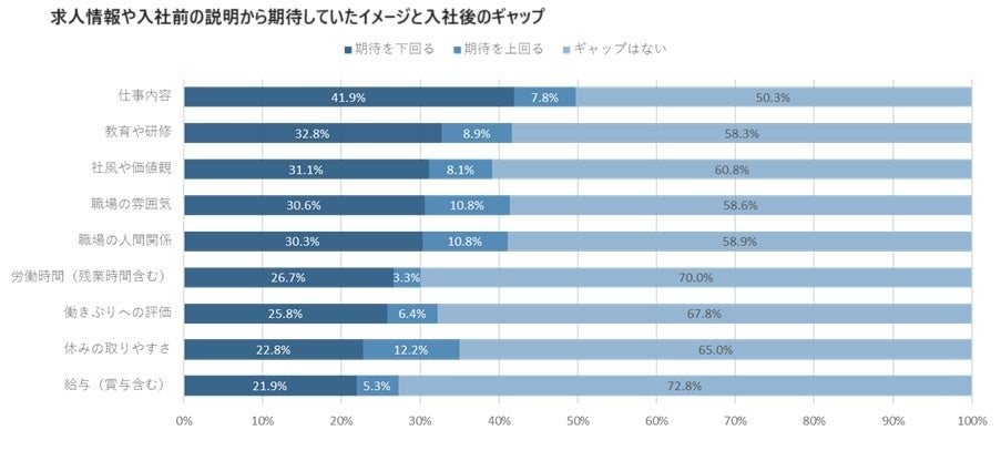 ギャップがあり「期待を下回る」回答項目を順にみると、「仕事内容」が41.9%と最も多く、次いで「教育や研修」32.8%、「社風や価値観」31.1%、「職場の雰囲気」30.6%、「職場の人間関係」30.3%、「労働時間(残業時間含む)」26.7%、「働きぶりへの評価」25.8%、「休みの取りやすさ」22.8%、「給与(賞与含む)」21.9%となっている。