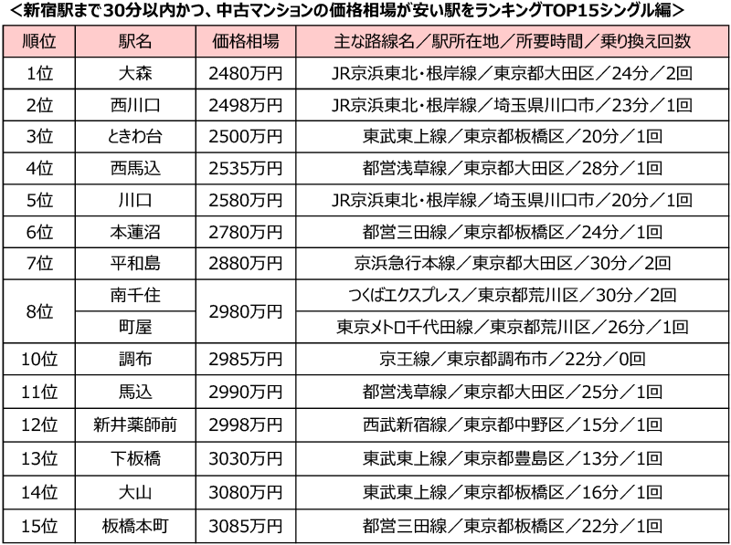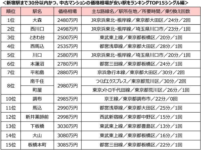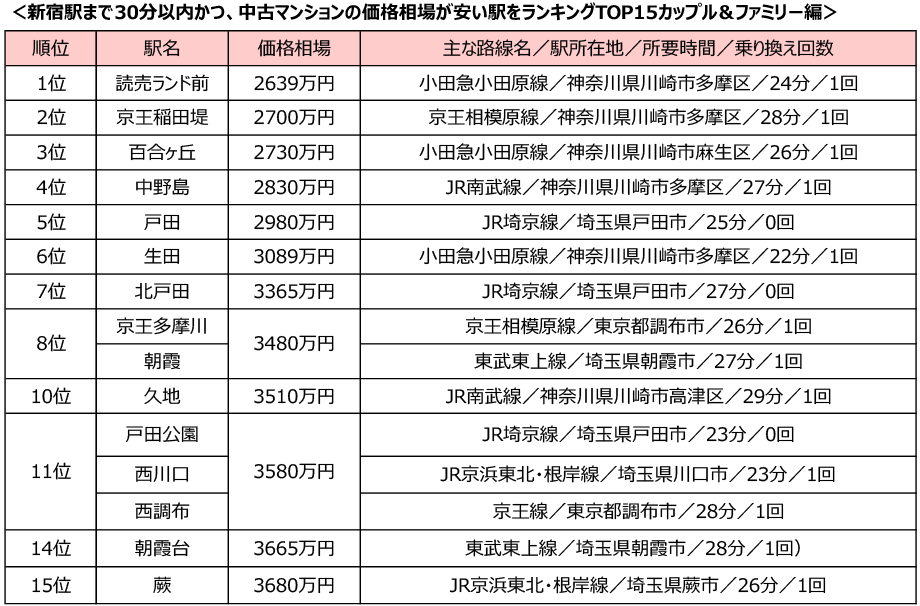 「新宿駅」まで30分以内、中古マンション価格相場が安い駅ランキング!「シングル向け」ランキングは都内の駅が多数ランクイン「カップル&ファミリー向け」ランキングTOP3は川崎市が独占