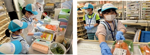 児童たちは、新鮮でピチピチ跳ねる「モサエビ」にビックリ!そして、特大のカレイに手を滑らせ掴めずにアワアワと戸惑っていた児童たちですが、鮮魚売り場の方からアドバイスを受けるとすぐにコツを掴み、魚を包装し、専用の機械で値札を付けることができました。また、緊張した様子で売り場に出て商品を丁寧に並べました。