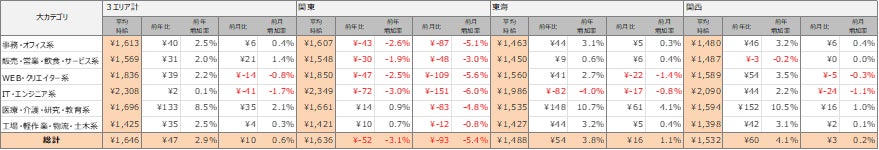 各エリアの平均時給について、関東エリアは1,636円(前年比52円減、前月比93円減)、東海エリアは1,488円(前年比54円増、前月比16円増)、関西エリアは1,532円(前年比60円増、前月比3円増)となりました。