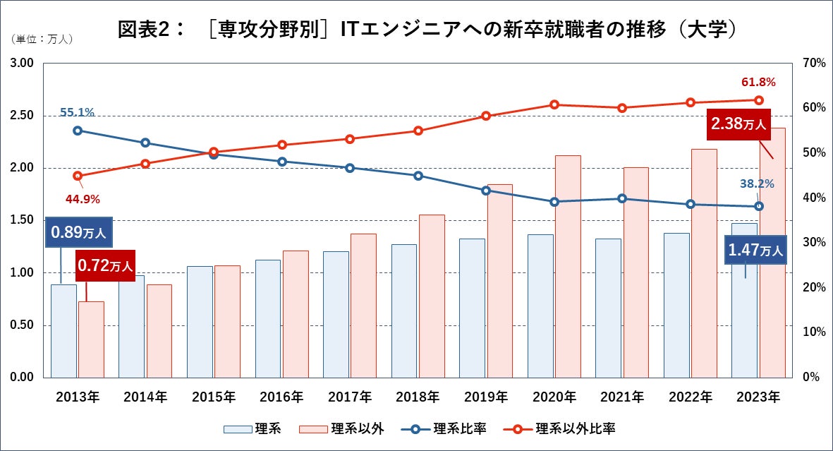 こうしたITエンジニアへの就職者数を出身学部別にみると、理系(理学部+工学部)学部出身の就職者が緩やかな増加である一方、文系を含む理系学部以外の就職者が大幅に増えていることがわかります。2013年の大学学部の新卒就職者においては、理系出身者が55.1%を占めていましたが、2023年には理系出身者が占める比率は38.2%まで低下し、61.8%を理系以外が占めています(図表2)。