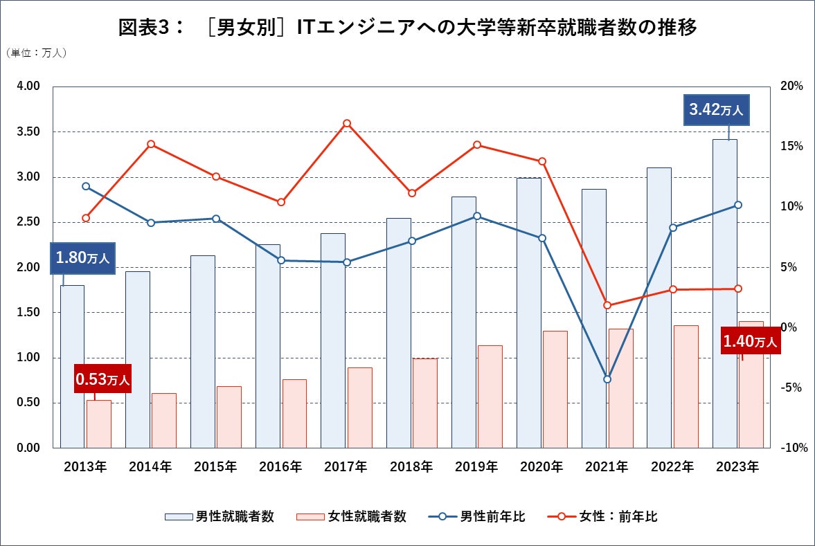 また、ITエンジニアへの新卒就職者を男女別にみると、男性、女性、いずれも増えていますが、女性の増加が顕著となりました。男性は2013年の約1.80万人から、2023年には約3.42万人へと10年間で1.9倍となる一方で、女性は2013年の約0.53万人から1.40万人と約2.7倍になりました(図表3)。2023年には、ITエンジニア就職者のうち29.1%を女性が占めています。