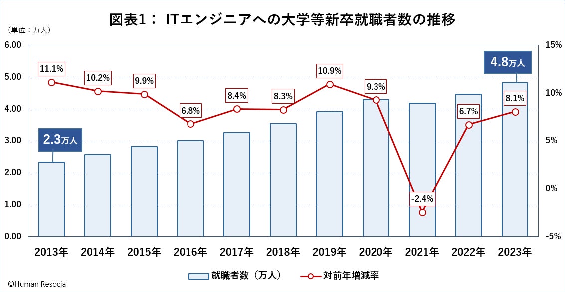 大学および大学院(修士・博士)を卒業し、ITエンジニアとして新卒で就職する卒業者数は、2013年の2.3万人から2023年には約4.8万人となり、10年間で2倍と大きく増えています。2021年には前年より2.4%減少となったものの、それ以外では前年を大きく上回っており、直近10年間の平均増減率は7.5%増となりました(図表1)。