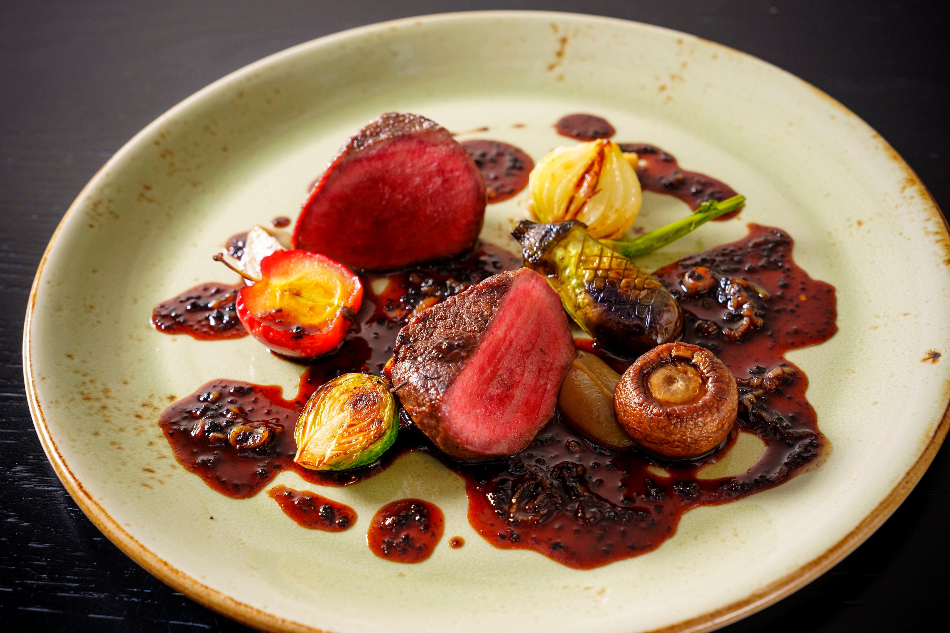 左から「エゾジカロースのポワレ ソースペリグー」、「ほろほろ鳥、碁石鳥、小鳩とフォアグラのパテ・アンクルート」