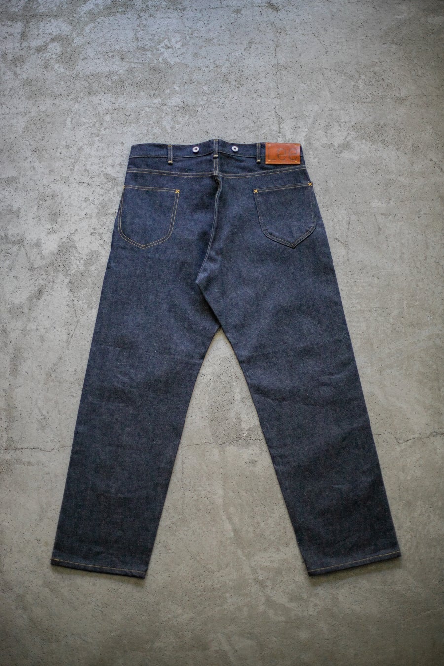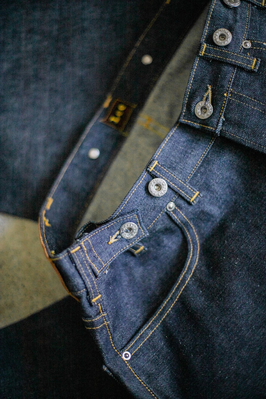 戦中に採用された右綾のピュアインディゴのデニムを用いて、(Leeは戦後左綾デニムを採用)本来簡素化されているはずのボタンをアジャスト用に増やし、広告用ならではのポケットを省いたディテールなど、特異な一着ができあがった。