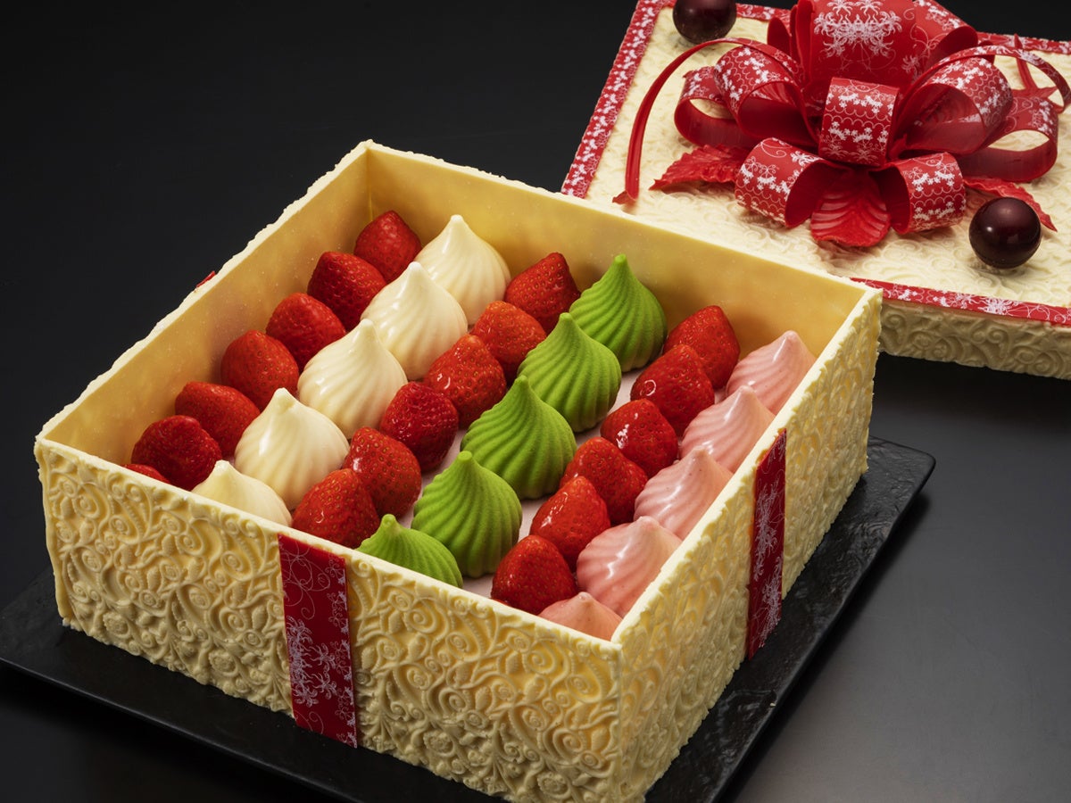 カカオ・トレース認証品のミルクチョコレートと、ASIAGAP認証の冷凍苺をジュレにして使用し、アーモンドクリームと風味豊かなパン・ド・ジェンヌを重ね、パティシエがひとつひとつ手作りで仕上げたリボンやボックスも全て食べられるチョコレートで出来ており、ボックス型に見立てたクリスマスケーキに仕上げました。