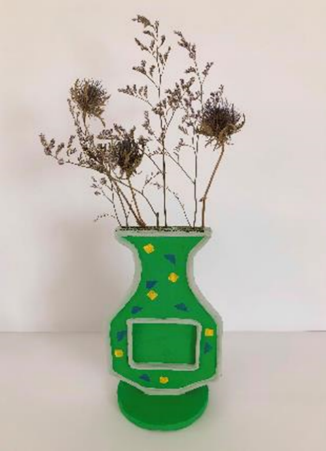段ボールと新聞紙を再利用してフラワーベースやフォトフレームを作ります。四角・丸・三角のスタンプで模様をつけたりして、柄を描いたりしてオリジナルフォトフレームを作ることができます。