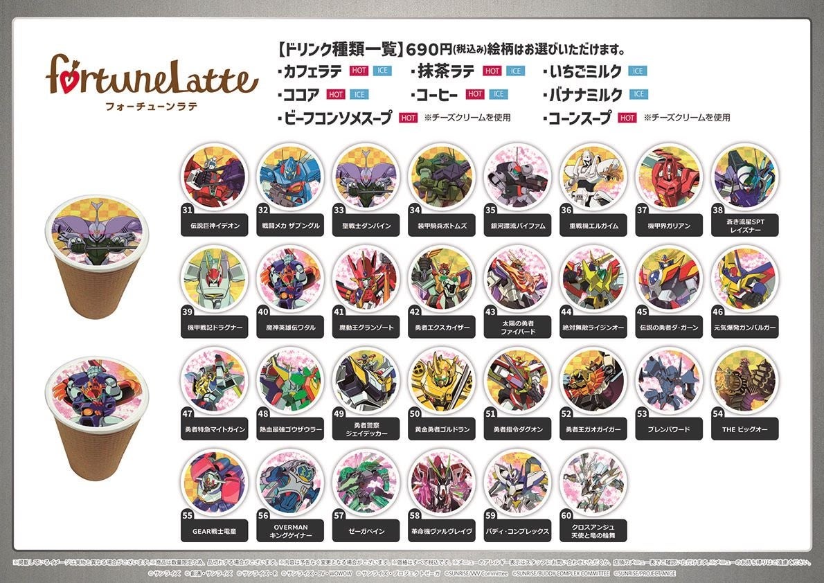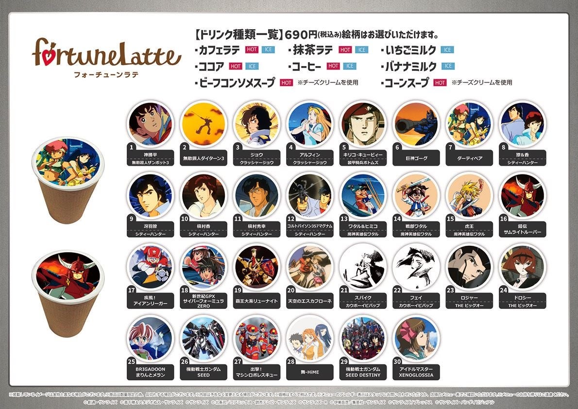 各「バンダイナムコ Cross Store」内のカフェでは、サンライズブランド作品のイラストをプリントした、ラテアートドリンクを販売(税込690円)します。11月2日(土)より、ラインアップを全面リニューアル。新規デザイン30種が仲間入りします。