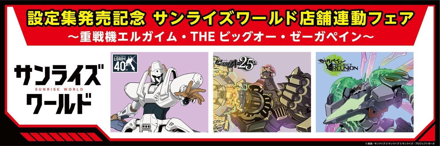 株式会社バンダイナムコフィルムワークスと株式会社バンダイナムコアミューズメントは、11月2日(土)より、サンライズワールド3店舗(TOKYO、YOKOHAMA、HAKATA)にて、2025年に設定集を発売予定の3作品(『重戦機エルガイム』『THE ビッグオー』『ゼーガペイン』)との連動フェアを開催します。