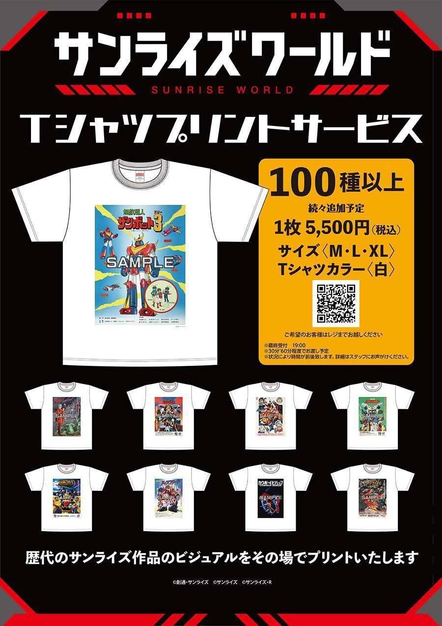 サンライズブランド作品のアニメ放送当時の番組宣伝ポスター柄など、100種類以上のデザインの中から好きなものをお選びいただき、その場でTシャツにプリントするサービスです。