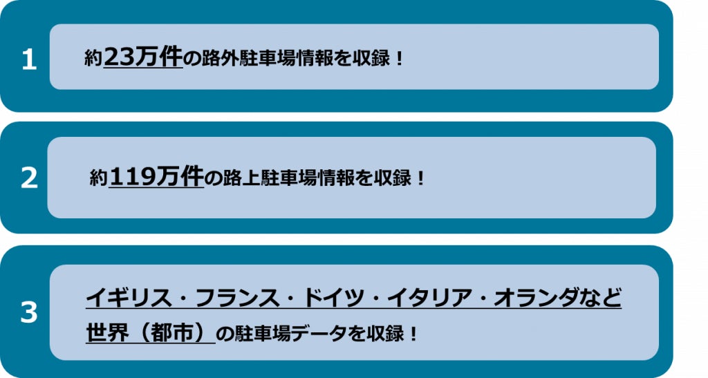 世界各地の駐車場データベース約23万件の路外駐車場、約119万件の路上駐車場の情報を収録しています。