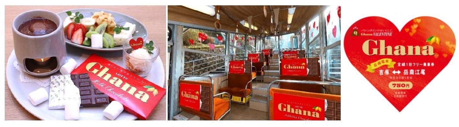 赤色が目を引くハート型のヘッドマークに加え、ロッテのキャンペーンポスターで車内がジャックされたコラボトレイン(9000形)が期間中運行いたします。また、岳南電車吉原駅窓口ではバレンタインならではのオリジナルデザインの1日フリー乗車券(750円)を500枚限定で販売いたします。なお、ご購入の方には、一口サイズの「ガーナミルク」をお一人様1個プレゼントいたします。