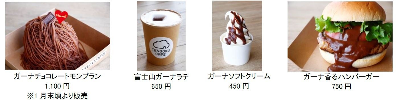 360度大パノラマの景観が楽しめる山頂展望カフェ「TENGOKU CAFE」では、十国峠でしか味わえない口当たり滑らかな「ガーナチョコレートモンブラン」と、富士山山頂のように盛り上がったふわふわのミルクにガーナチョコレートをトッピングした「富士山ガーナラテ」が登場。また、山麓食事処「とうげぐるめ」では、ガーナチョコレートを加えたデミグラスソースがたっぷりかかった食べ応えのある「ガーナ香るハンバーガー」と、休憩のおともにぴったりの「ガーナソフトクリーム」を販売いたします。