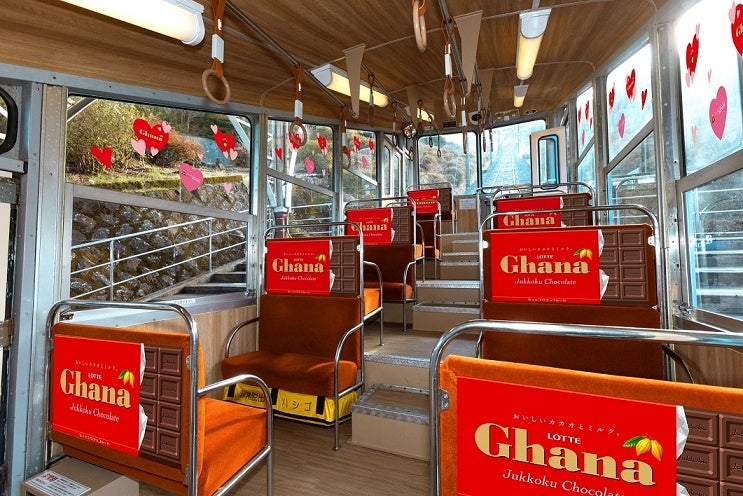 期間中、「十国峠 山麓駅」と展望台のある山頂の「十国峠 山頂駅」を結ぶ全長316mのケーブルカーがコラボバージョンに切り替わります。ガーナミルクの赤いパッケージで飾り付けられた座席シートに加え、窓にはハートがあしらわれ、バレンタインならではの特別な車内となっております。