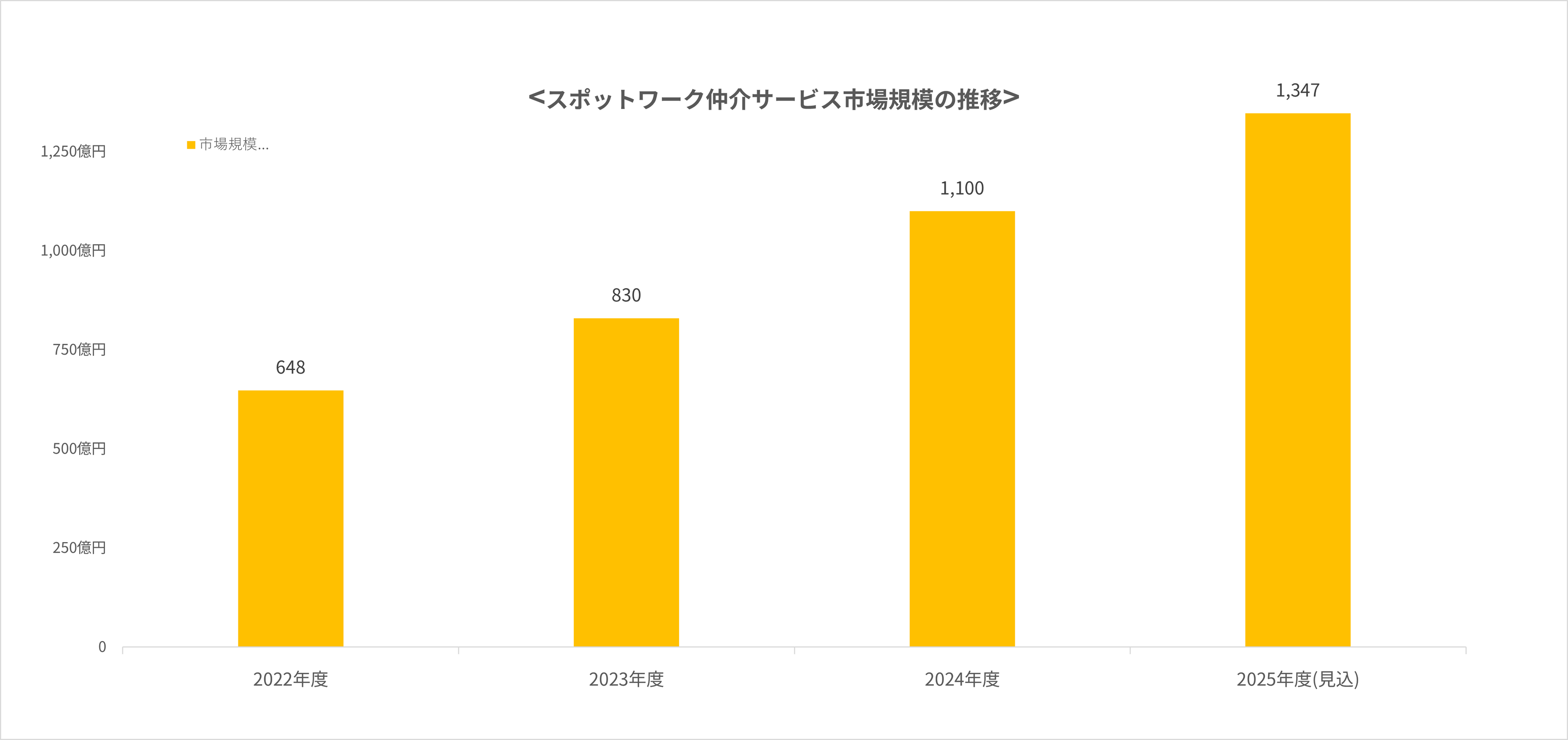 矢野経済研究所の調査によると、2024年度のスポットワーク仲介サービス市場(単発バイト求人情報サービス市場、短期バイト人材紹介サービス市場、人材マッチングサービス市場の3市場計)の市場規模は、前年度比32.5%増の1,100億円となり、2025年度は前年度比22.5%増の1,347億円が見込まれるなど、市場規模が大幅に拡大しています。