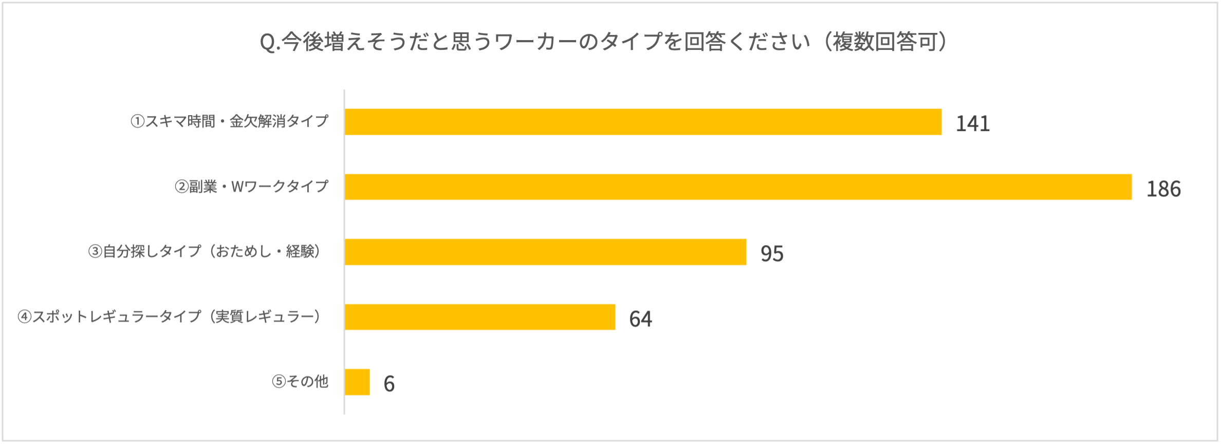 また、これに次いでタイプ③「自分探しタイプ」(30.4%)やタイプ④「スポットレギュラータイプ」(20.4%)も増加が予測される傾向にあり、スポットワークが「急な金銭補填」という短期的な価値だけでなく、「キャリア形成」や「多様な働き方の実現」とい長期的な価値提供へと移行するスポットワーク2.0の潮流が現場で感じられていることを示しています。タイプ①「スキマ時間・金欠解消タイプ」(45.4%)も市場拡大に伴い、増加すると予測されています。