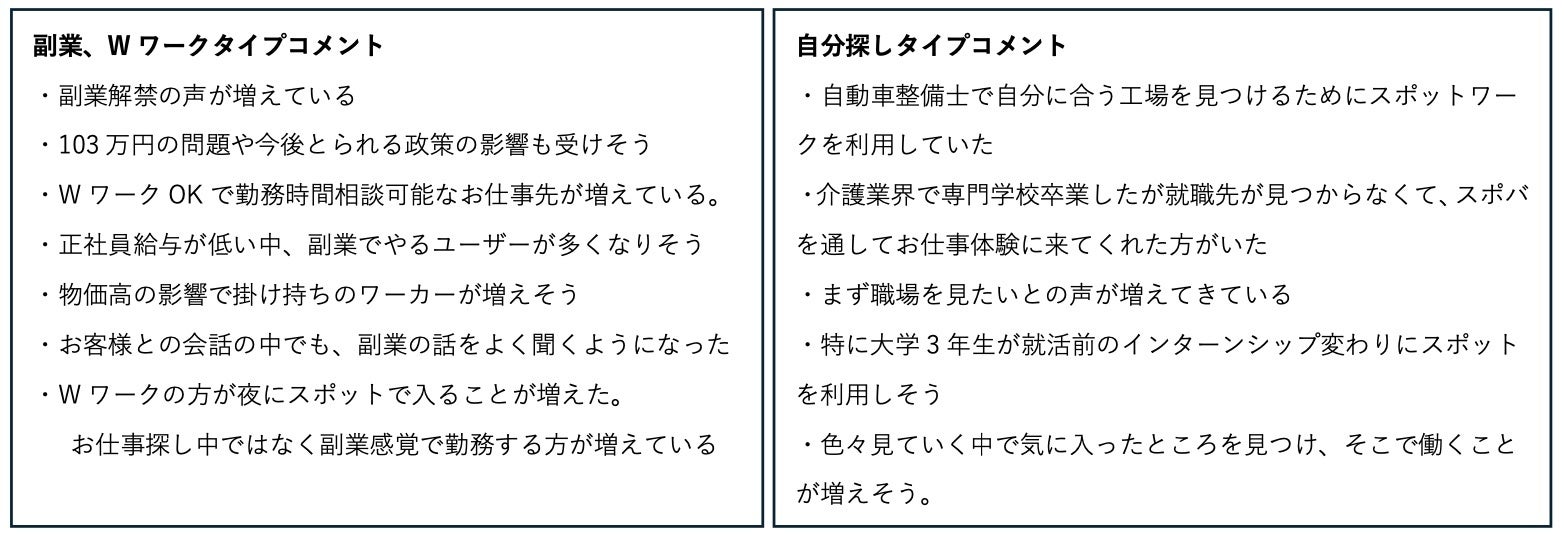 ・キャリア形成:新しい分野に挑戦したい、自分に向いている仕事や職場の雰囲気をお試しで見極める。スポットワークから正社員になった事例も。