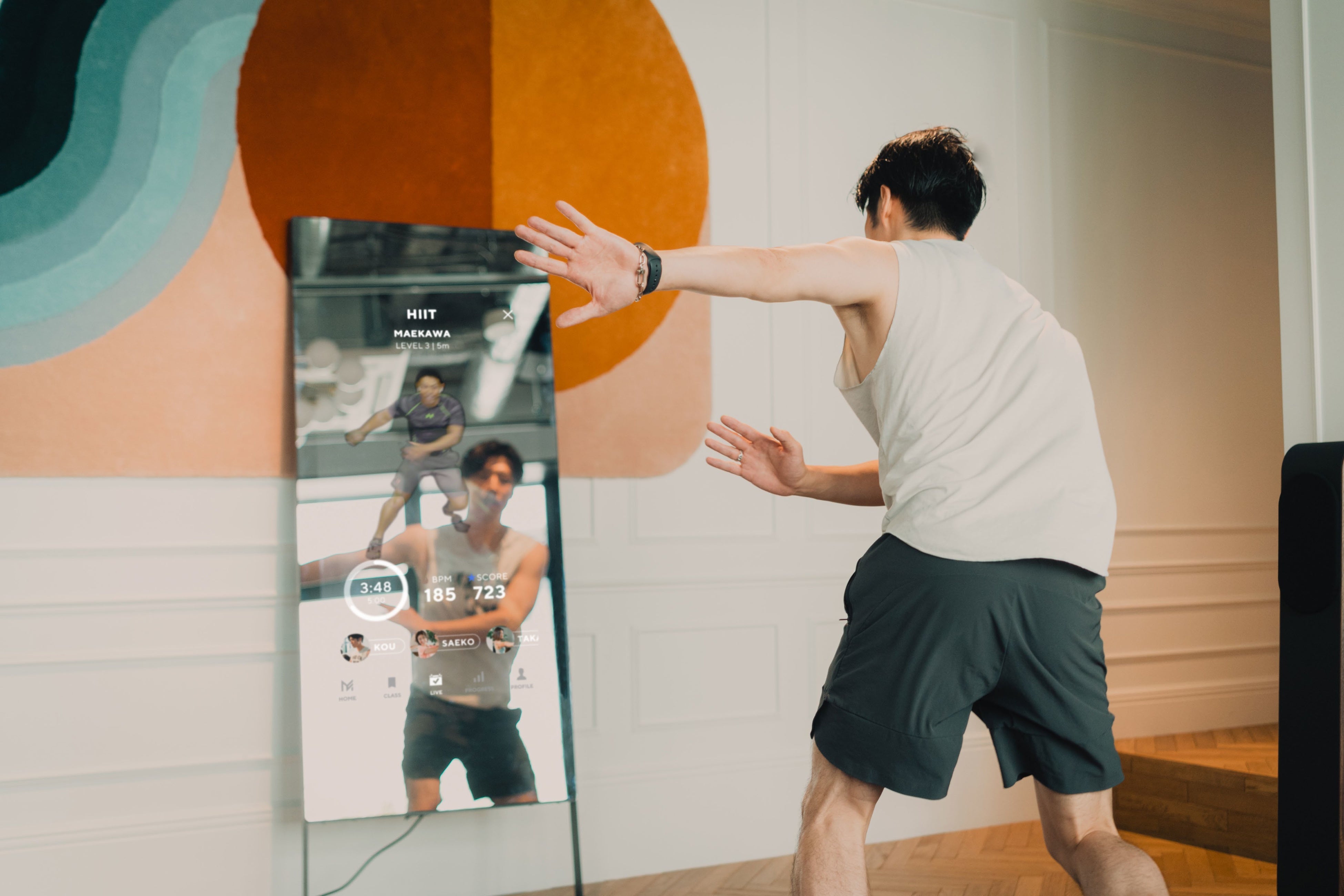 ※専用のミラーデバイスと専用アプリによって、自宅に居ながらプロのトレーナーによる本格的なトレーニングプログラムをオンラインで体験できるサービスです。オンラインで繋がりながらフィットネスを楽しむことができるLIVEレッスンや、ヨガや筋力トレーニング、瞑想、ダンスなど、約300種類以上のコンテンツをミラーに映る自分の動きを確認しながら、いつでも好きな時間に受けられます。