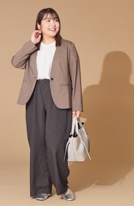 すっきりとしたシルエットが美しく、顔周りをシャープに見せるカラーレスジャケット。落ち着いたトーンのブラウンは、知的で信頼感のある着こなしを叶えます。ボトムはあえてドット柄のイージーパンツを合わせ、堅苦しさを感じさせないこなれた印象に。総ゴム仕様のウエストにゆとりのあるシルエットで、デスクワークの日も快適に過ごせます。