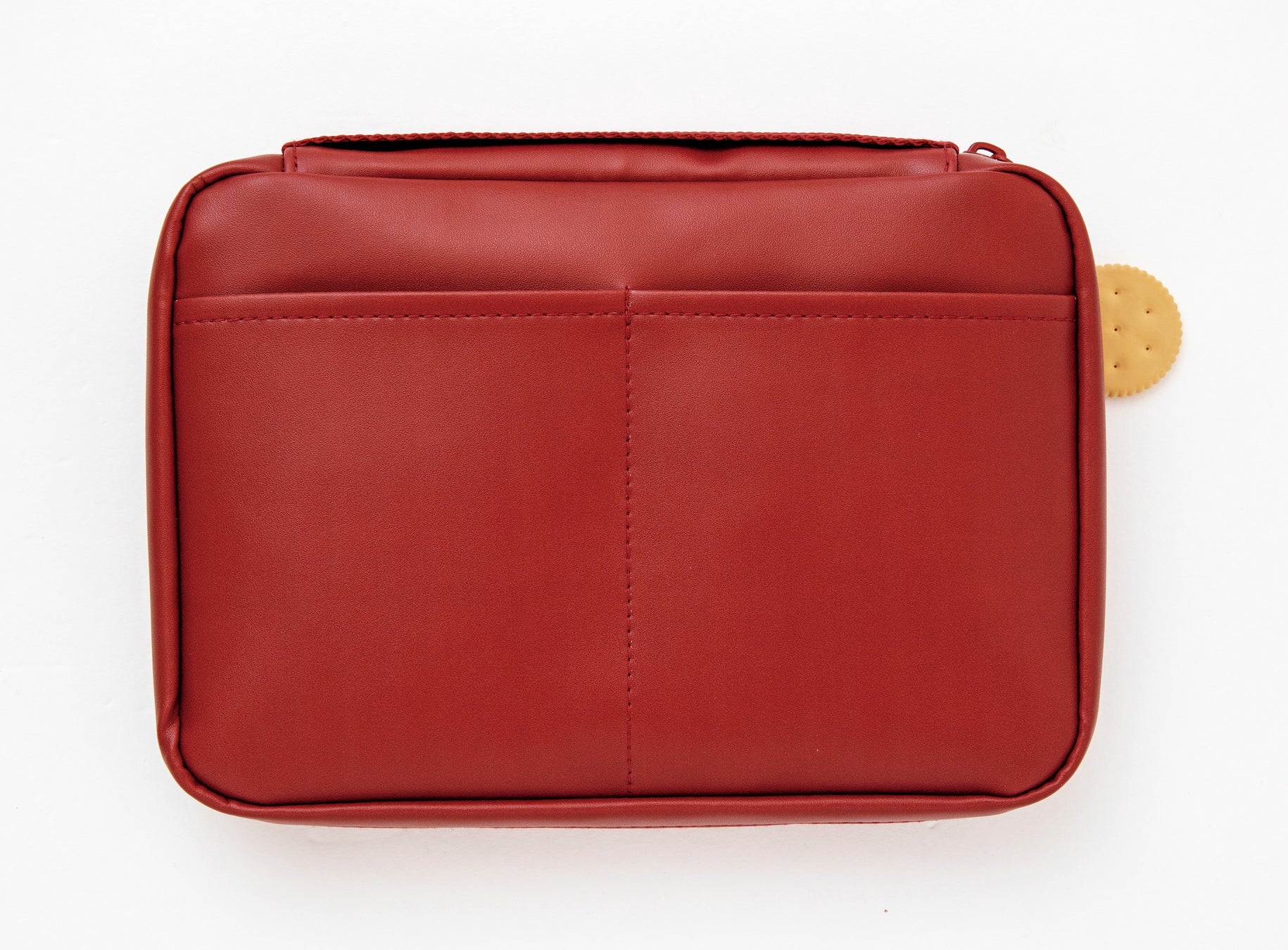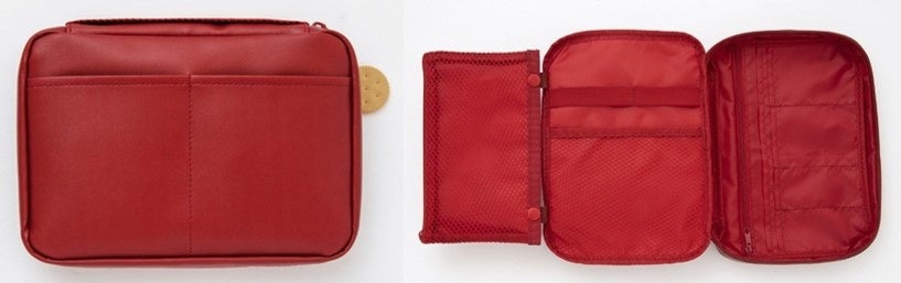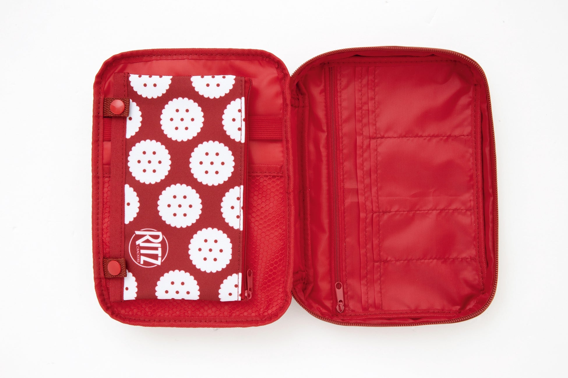 本誌限定のスペシャルアイテムは「リッツ クラッカー」の箱パッケージのようなマルチポーチと、まるでクラッカーなチャーム、取り外せるクラッカー柄ミニポーチの豪華3点セット。マルチポーチにはファスナーポケットやメッシュポケットなどポケットが複数あり、かわいいだけでなく実用性にもこだわりました。文具やコスメなど、さまざまなものの収納に活躍するマルチポーチとなっています。