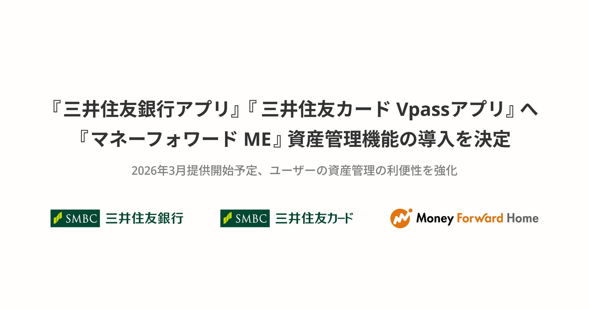 株式会社三井住友銀行、三井住友カード株式会社、マネーフォワードホーム株式会社は、2026年3月より、三井住友銀行が提供する『三井住友銀行アプリ』および三井住友カードが提供する『三井住友カード Vpassアプリ』に、お金の見える化サービス『マネーフォワード ME』の資産管理機能を導入することを決定しました。