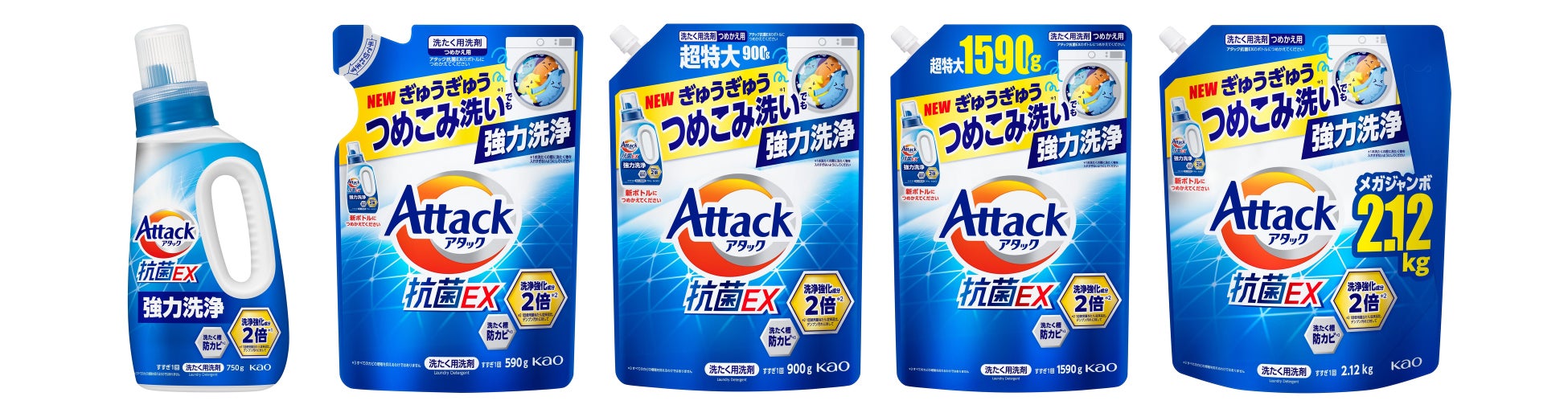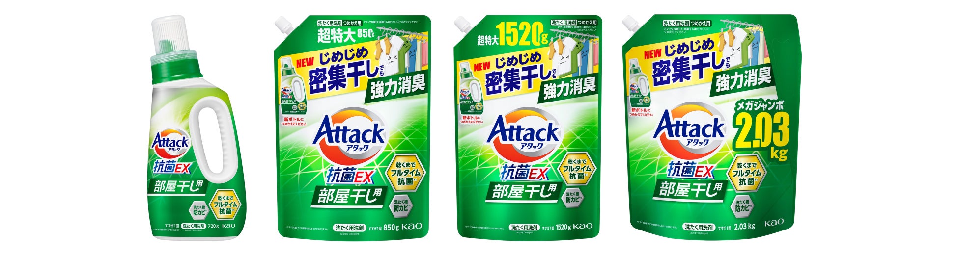 そこで、「アタック抗菌EX」シリーズを改良新発売します。洗浄強化成分を2倍*2 に増量した「アタック抗菌EX」は、“つめこみ洗い”でも高い洗浄力を発揮し、「アタック抗菌EX 部屋干し用」は、じめじめした環境での”密集干し”でもイヤなニオイを防ぎます。