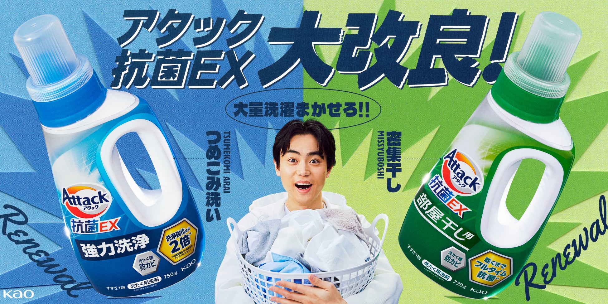 花王株式会社の衣料用洗剤「アタック」は、2024年6月29日、衣料用液体洗剤「アタック抗菌EX」「アタック抗菌EX 部屋干し用」を改良新発売します。「アタック抗菌EX」シリーズの特長である抗菌*1 性能に加えて、「アタック抗菌EX」は洗浄強化成分を2倍*2 に増量しました。また、リニューアルに合わせて、ユニバーサルデザイン視点を取り入れて開発した新ボトルを採用しました。