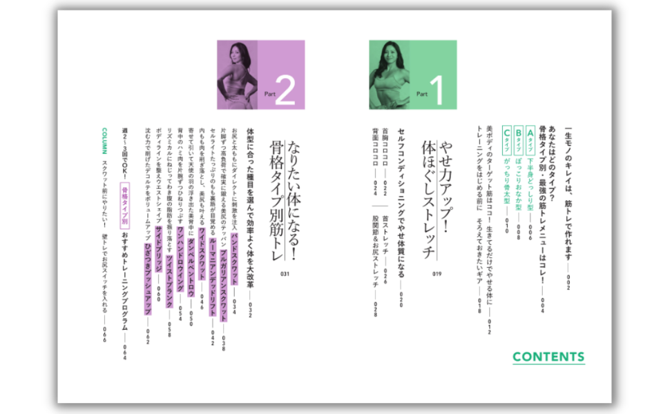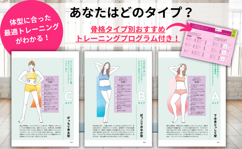 筋トレは、おなかや腰回りなど絞りたいところは絞り、お尻やバストなどボリュームアップしたいところは大きくできる唯一のボディメイクです。これは、なりたい体に合わせてトレーニングメニューを組むことで実現できます。本書では、骨格、脂肪や筋肉の付き方、体つきの特徴から、体型をおもに3つに分け、【骨格タイプ別のトレーニングプログラム】を考案しました。まずは、週2回、2カ月続けてみましょう。必ず理想的な体に近づいていくはずです。