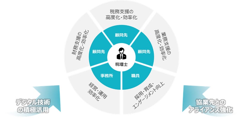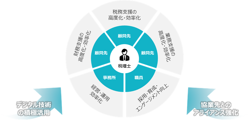 煩雑な間接業務や業種特有の手続きなど、顧問先の日常業務のDXを後押しするサービスを提供することで、業務支援の高度化・効率化を図ります。