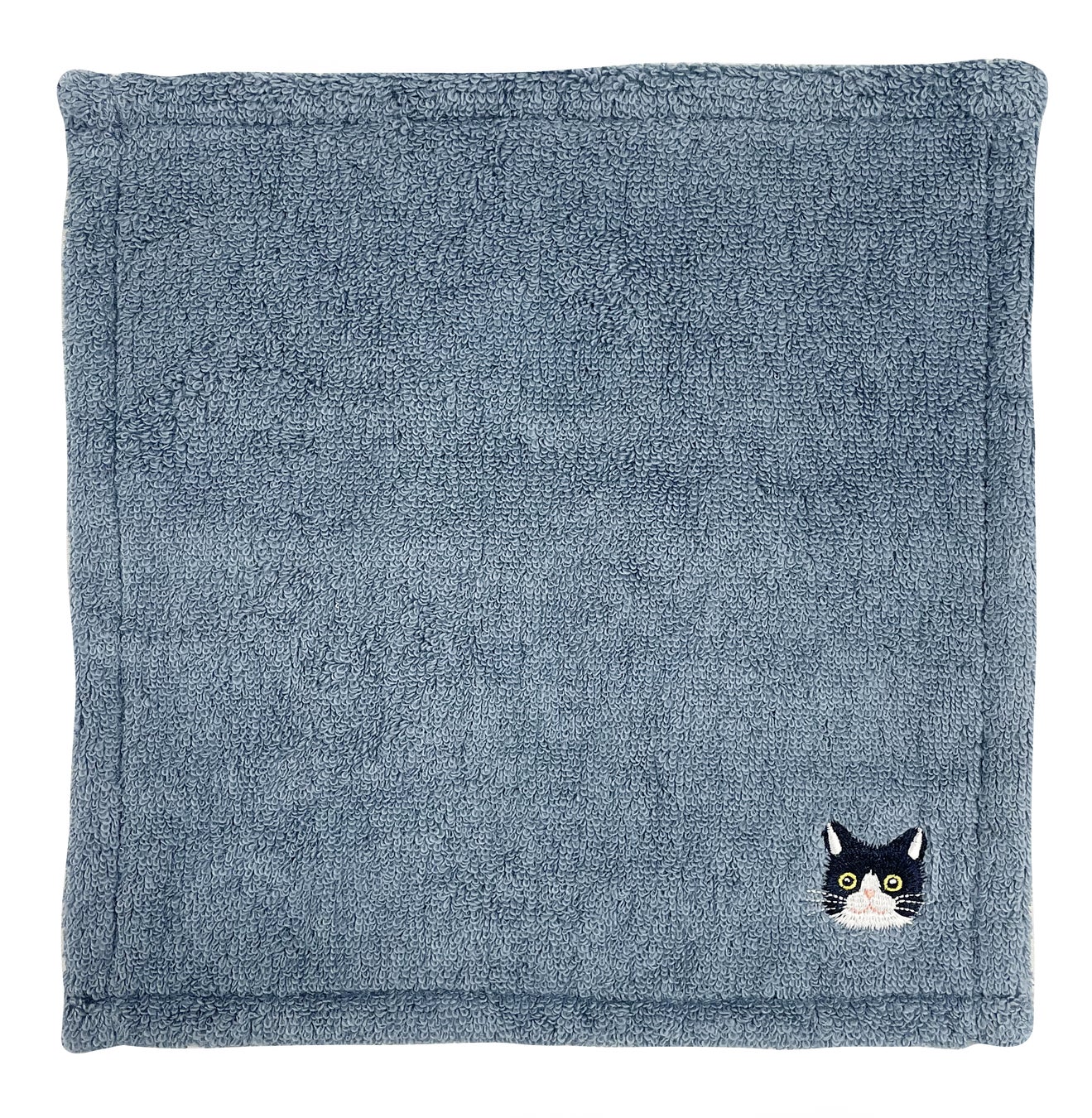 猫のイラストとカラフルなパッケージがかわいらしい、ワンポイント刺繍付きハンカチタオル。