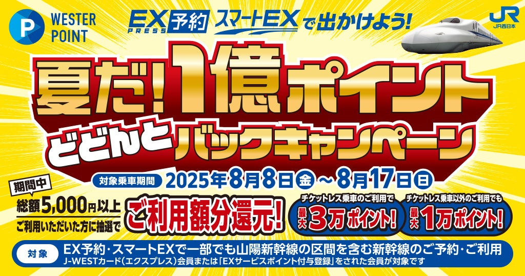 「EXサービス」で期間中総額5,000円以上ご利用いただいた方を対象に、抽選でご利用額分のWESTERポイント(最大30,000ポイント、還元総額1億ポイント)を還元するキャンペーンを開催します。
