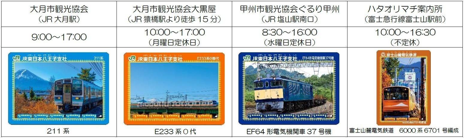 〇スタンプラリー開催期間中に、大月市・甲州市の観光協会または富士山駅のハタオリマチ案内所でお買い物をしていただくと「鉄カード」をプレゼントします。