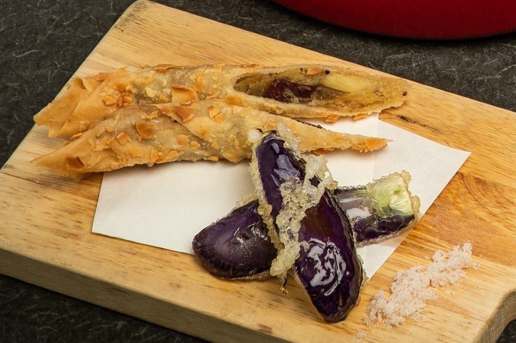 [揚物] お芋の春巻きと茄子の白扇揚げ