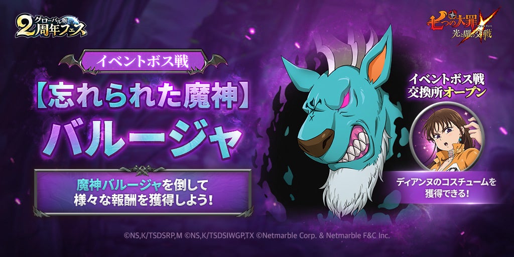 「七つの大罪」原作者の鈴木央氏描きおろしの魔神「バルージャ」がオリジナルボスとして新登場いたします。