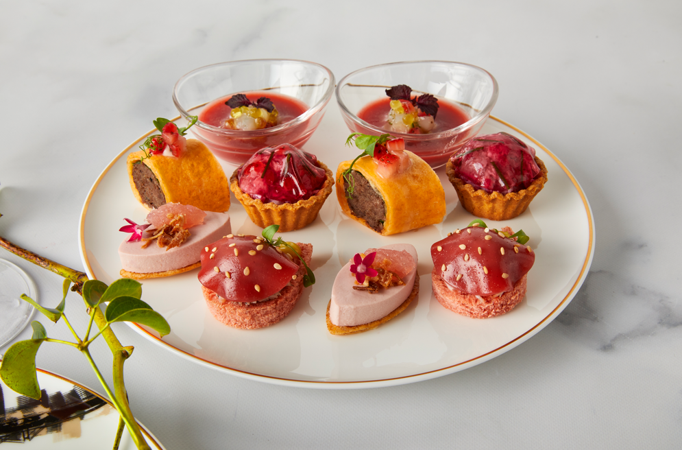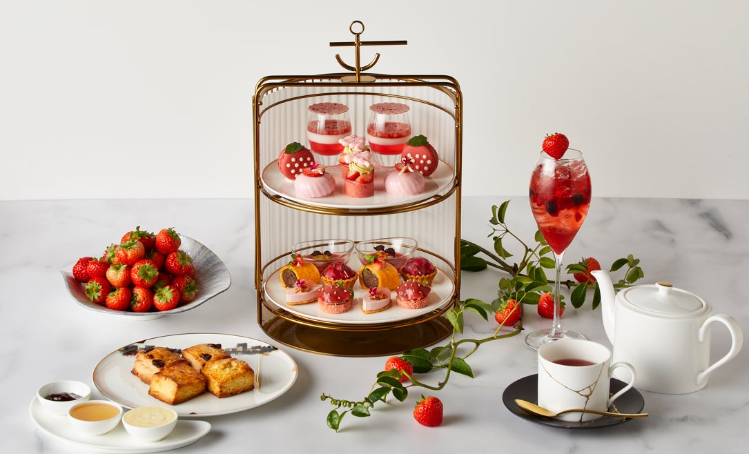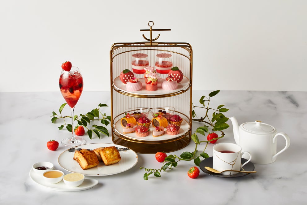 スイーツはエグゼクティブ・ペストリーシェフの白山による甘酸っぱいイチゴにカルダモンのほのかな香りが引き締める「苺ジュレ カルダモンパンナコッタ」や「ストロベリーとホワイトショコラマカロン」などの全4品、セイボリーはシェフ・ド・キュイジーヌの横山による「苺と玉葱のブランマンジェ 湘南レッドのピクルス」や「苺で煮込んだ牛頬肉のロール グリュイエール ルッコラ」を含む全5品をご用意し、ストロベリーピューレにジンジャーエールやベリーを加えたウェルカムドリンク「ストロベリーアロマ」をお付けしてご提供いたします。また、土日・祝日限定でシェフおすすめのフレッシュストロベリーをお付けいたします。