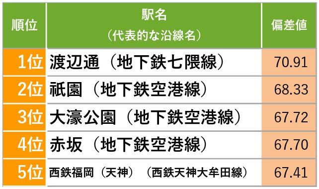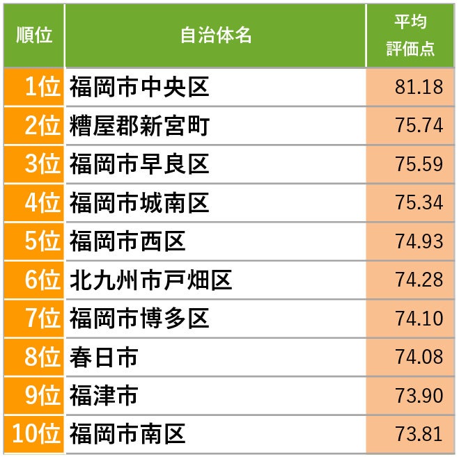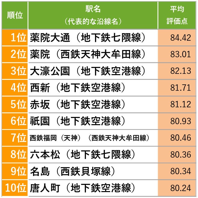 <自治体>では「福岡市中央区」が1位<駅>では「薬院大通」が1位