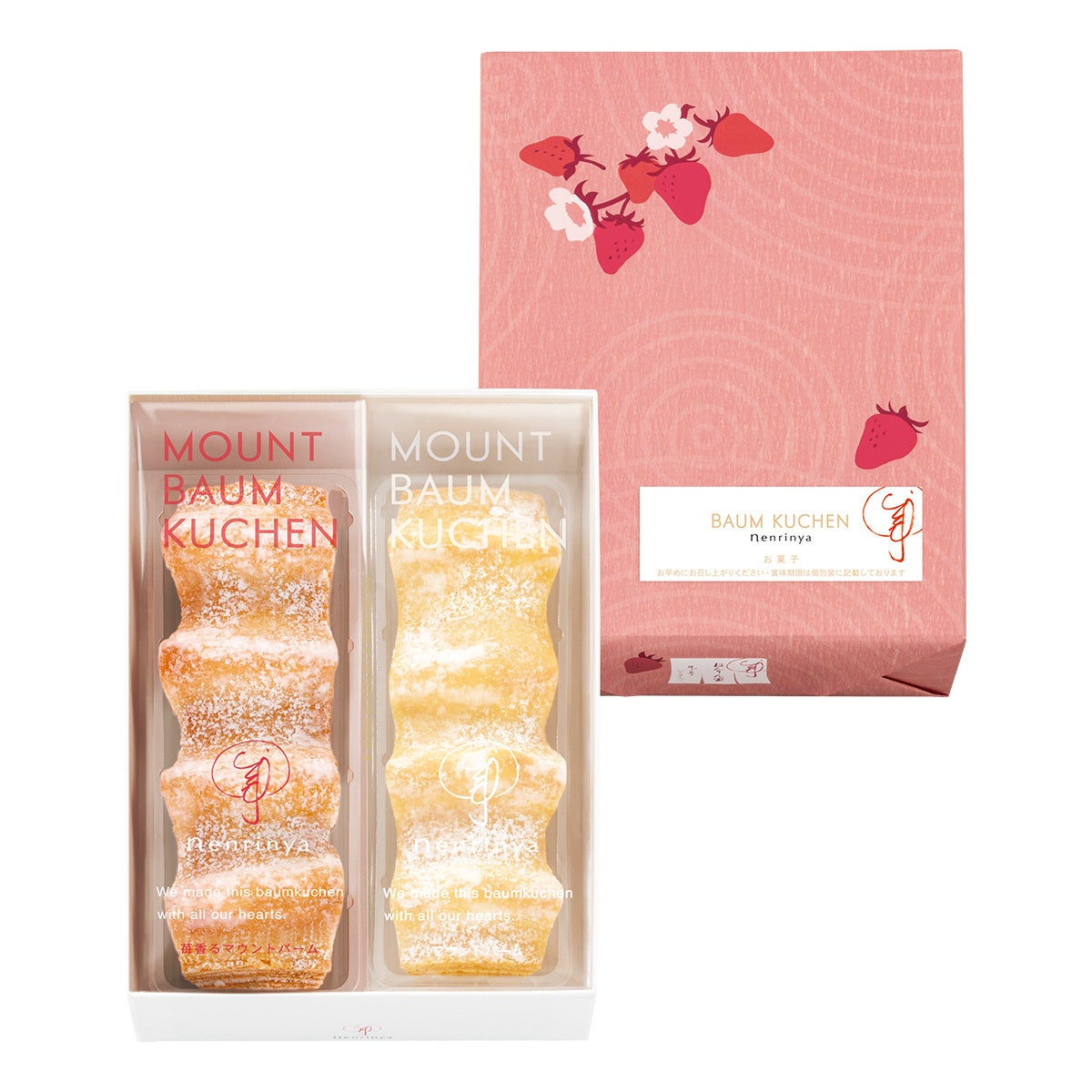 バター⾵味たっぷりの代表作『マウントバーム しっかり芽』と、春限定『苺香るマウントバーム』。2味を存分に味わう、食べ比べが楽しい満足感のある詰合せです。