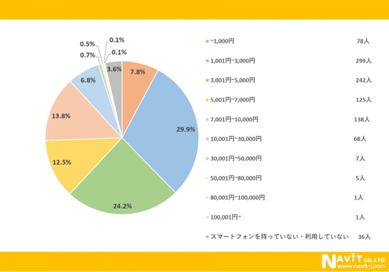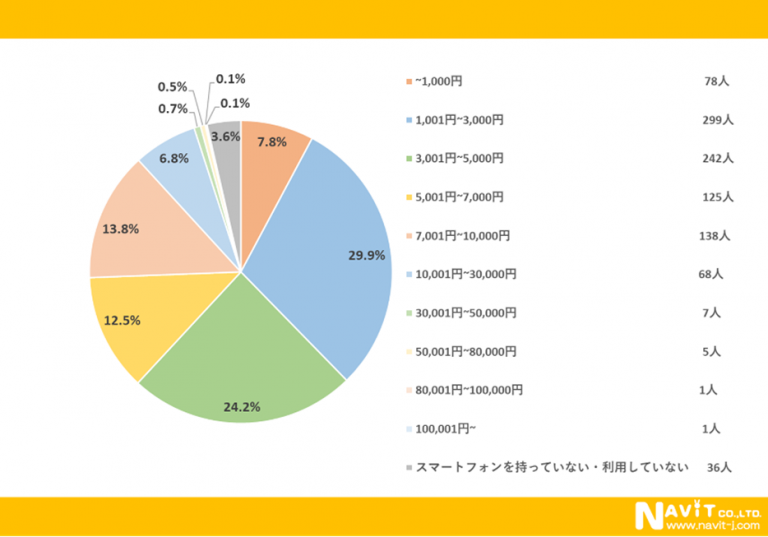 1か月のスマートフォンの利用料金は、「1,001円~3,000円」が最多