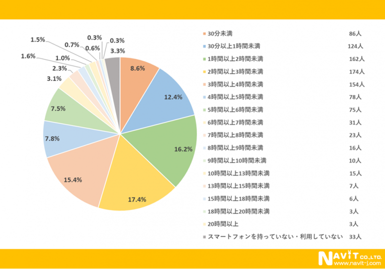 「スマートフォンを1日何時間利用していますか?」という質問については、「2時間以上3時間未満」が17.4%、「1時間以上2時間未満」が16.2%、「3時間以上4時間未満」が15.4%という順になりました。中には「20時間以上」という回答も複数名いらっしゃるなど、個人差が分かれる結果になりました。