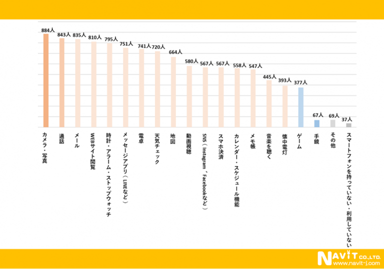 「スマートフォンで利用している機能・サービスは何ですか?」という質問を複数回答可で行ったところ、「カメラ・写真」が884人、「通話」が843人、「メール」が835人という順になりました。