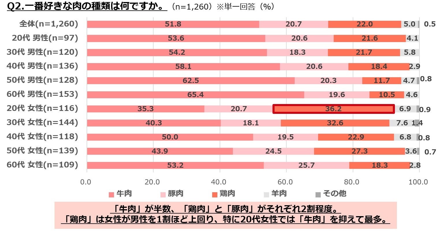 ・一番好きな肉は「牛肉」が半数で最多。「鶏肉」と「豚肉」がそれぞれ2割程度。「鶏肉」は女性が男性を1割ほど上回り、特に20代女性では「牛肉」を抑えて最多。