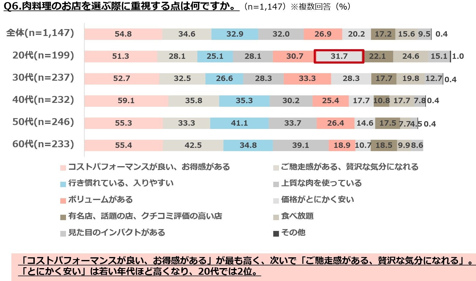 ・肉料理の店を選ぶ際の重視点は、「コストパフォーマンスが良い、お得感がある」が最も高く、次いで「ご馳走感がある、贅沢な気分になれる」。「とにかく安い」は若い年代ほど高くなり、20代では2位。
