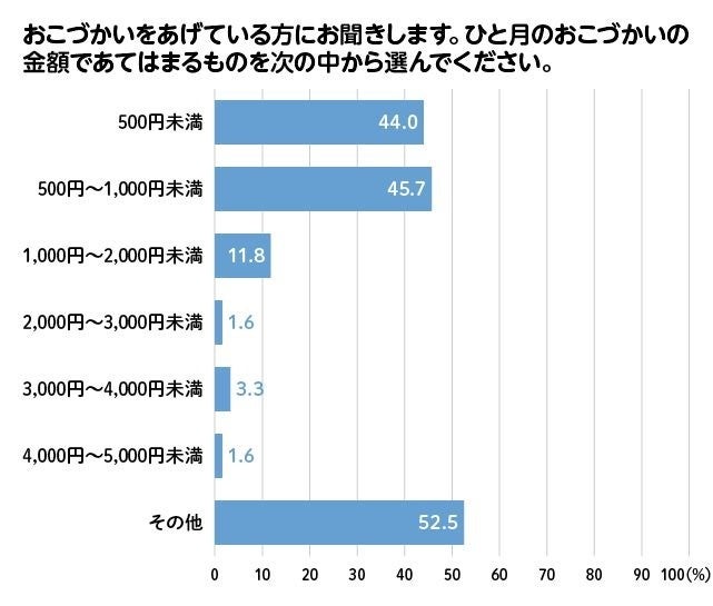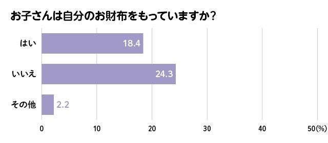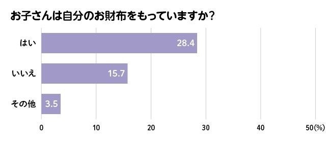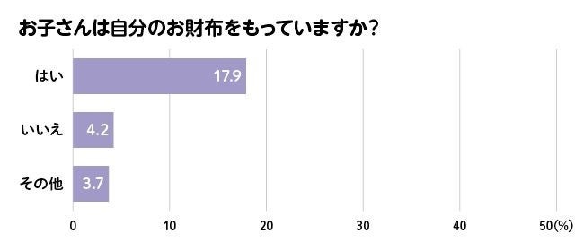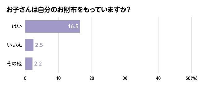 子どもが自分の財布を持っているかどうか聞いたところ、小学生以上では「持っている」という回答が多く、低学年では3人に2人、中学年では5人に4人、高学年では8人中7人が財布を持っている結果となりました。毎月決まった額のお小遣いをあげている人は少ないものの、子どもがいくらかの自分のお金を財布で管理している家庭が多いこともわかります。