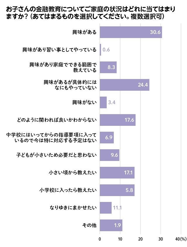2021年度からは中学校で、2022年度からは高校で、指導要領に従って順次実施される予定の金融教育。今後、各家庭だけでなく、学校の科目としてもお金について考える機会が増えます。各家庭はどのように捉えているのか、もしくはすでになにか取り組んでいるのか聞いてみると、多くの過程で30.6%が「興味がある」「小さいころ・小学生から教えたい」(合わせて22.9%)と回答する一方で、「興味はあるが具体的にはなにもやっていない」(24.4%)という回答が多い結果となりました。子どもの金融教育の必要性を感じながらも、子育て世代の多くは自分たちがお金教育を受けていないため、具体的に子どもへどう伝えるべきか、取り組み方がわからないのが本音のようです。