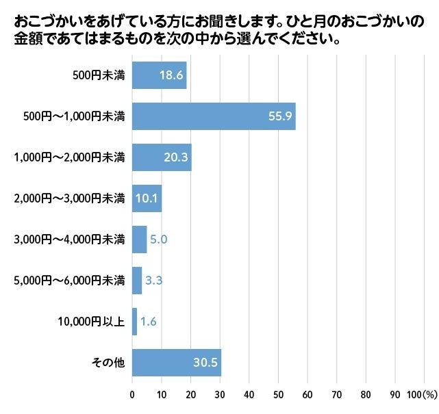 お小遣いをあげている家庭に、ひと月にいくらくらいのお小遣いを子どもにあげているか聞いたところ、未就学〜低学年(小学1・2年生)は「500円未満」が多数派。中学年(小学3・4年生)に上がると同時に「500円〜1000円未満」が増え、高学年(小学5・6年生)では「500円〜1000円未満」が圧倒的多数派となる結果に。高学年になると1000円以上あげているご家庭の割合も増えています。