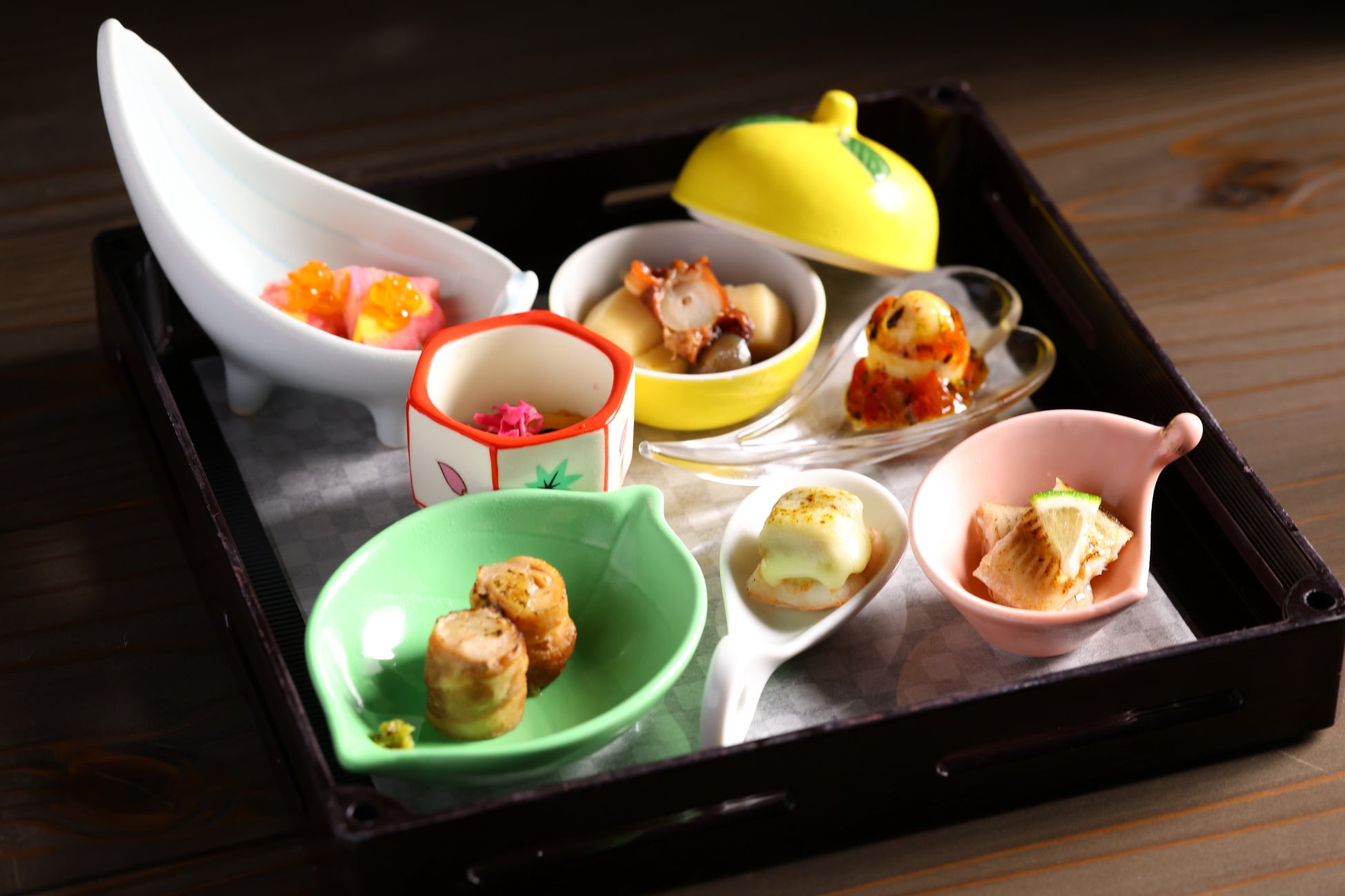 お献立の最初を彩るのは、湯河原や近郊の話題施設・歴史・自然などをテーマにした全7品の前菜です。
