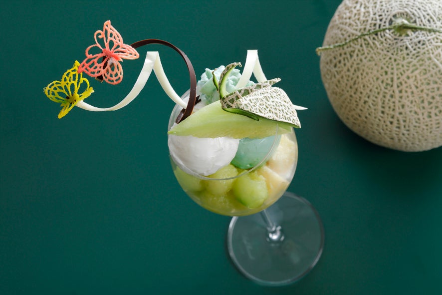 毎月テーマを替えてお届けするパルミエールのパフェ。6月のテーマは『四日市メロン』。地元・四日市市上海老町で温室栽培されたマスクメロンを使いました。メロンの果肉をくり抜き一口サイズに、ジューシーな甘さと芳醇な香りが口いっぱいに広がります。蝶々がモチーフのチョコをあしらい可愛らしく、彩りも爽やかに仕上げました。