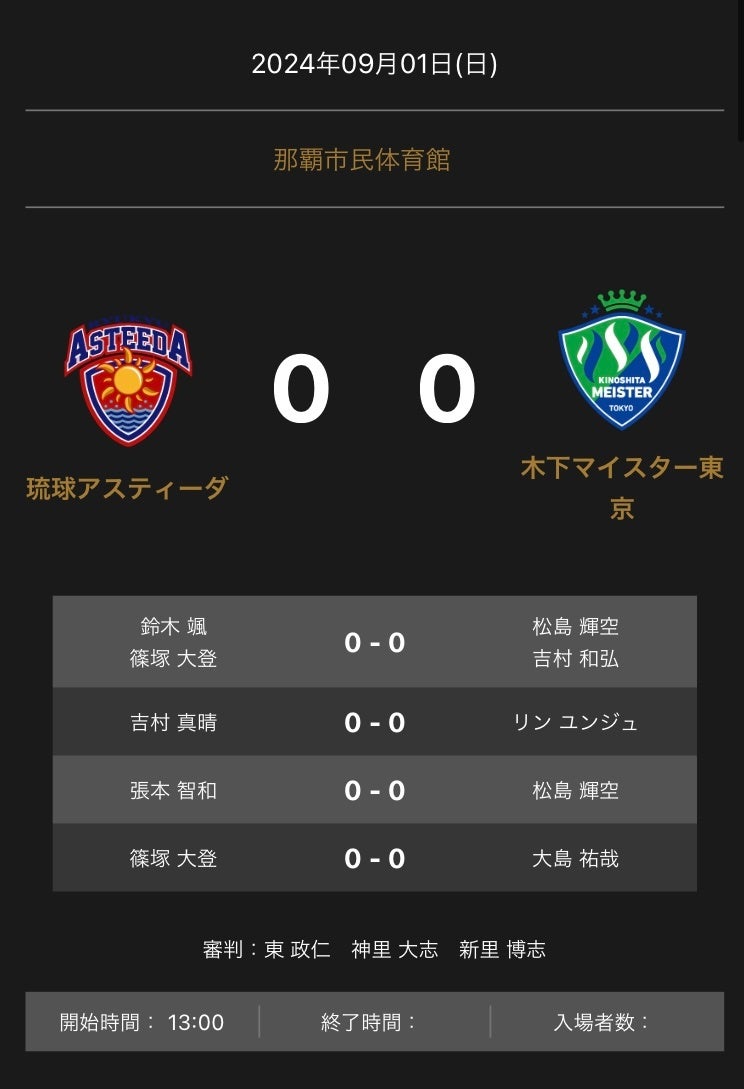 ノジマTリーグ 2024-2025シーズン 公式戦 9月1日開催の「琉球アスティーダ vs 木下マイスター東京」のオーダーを発表いたします。