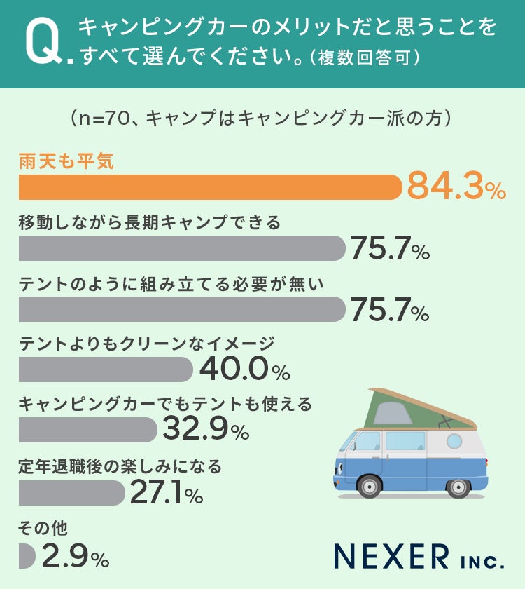 さらに「移動しながら長期キャンプできる」と「テントのように組み立てる必要が無い」も、7割以上の方が回答していました。