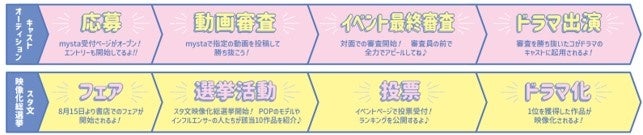 ミニドラマのキャストオーディションを、スマホ発のスターを発掘するオーディションアプリ「mysta」で実施します。動画審査、イベント最終審査を経てグランプリや特別賞に輝くと、ミニドラマで俳優デビューするだけでなく、雑誌「Popteen」のモデル起用など、様々な特典が受けられます。
